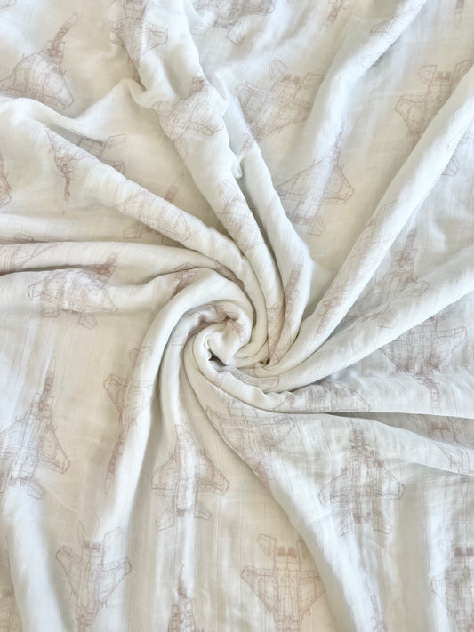 A-10 Blueprint Fighter Jet Muslin Swaddle/Blanket- TAUPE GREY
