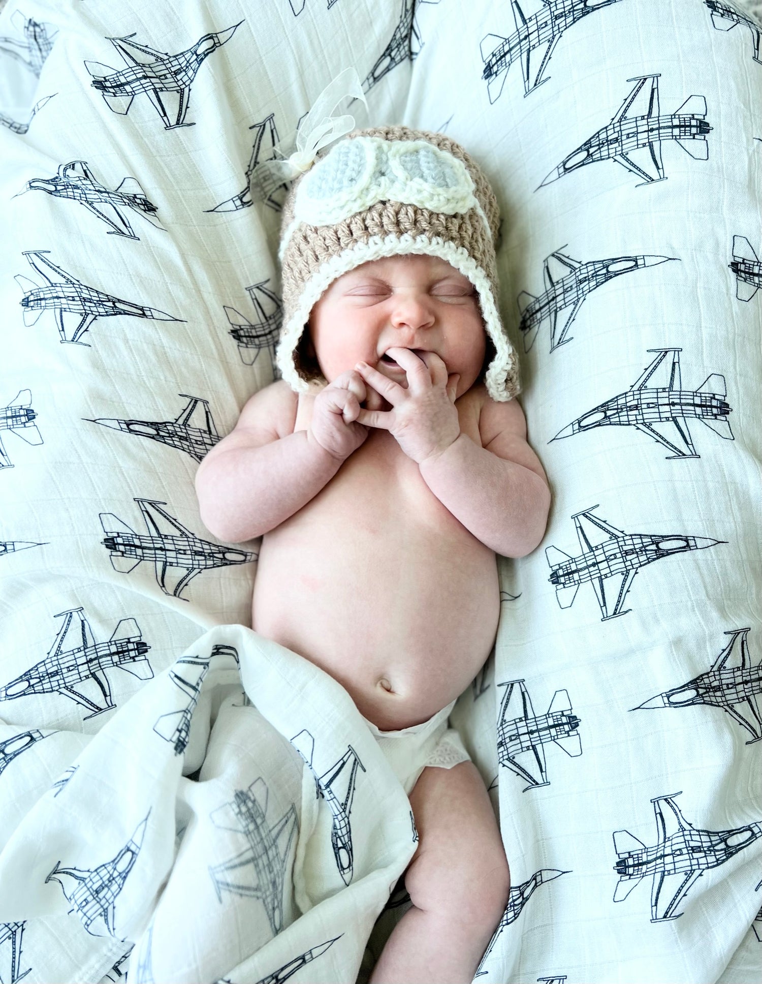 Aviation loving families are near and dear to my heart. It is extremely rewarding when I see pictures of newborns wrapped in one of our swaddles at the hospital. Or when a customer requests a specific airplane design that holds sentimental value. These requests often came from individuals wanting to honor the legacy of their loved ones, like grandparents who had flown these aircraft.