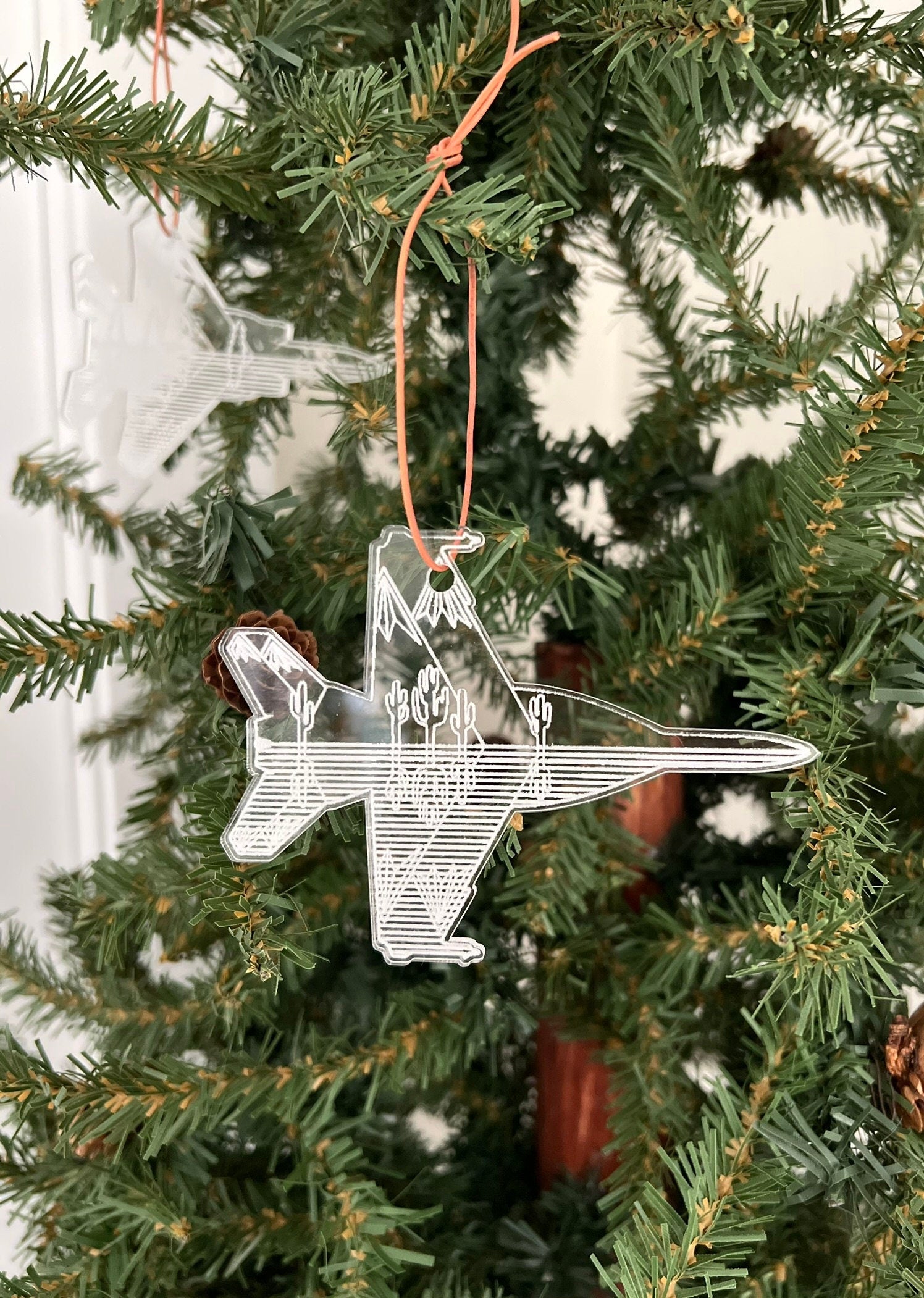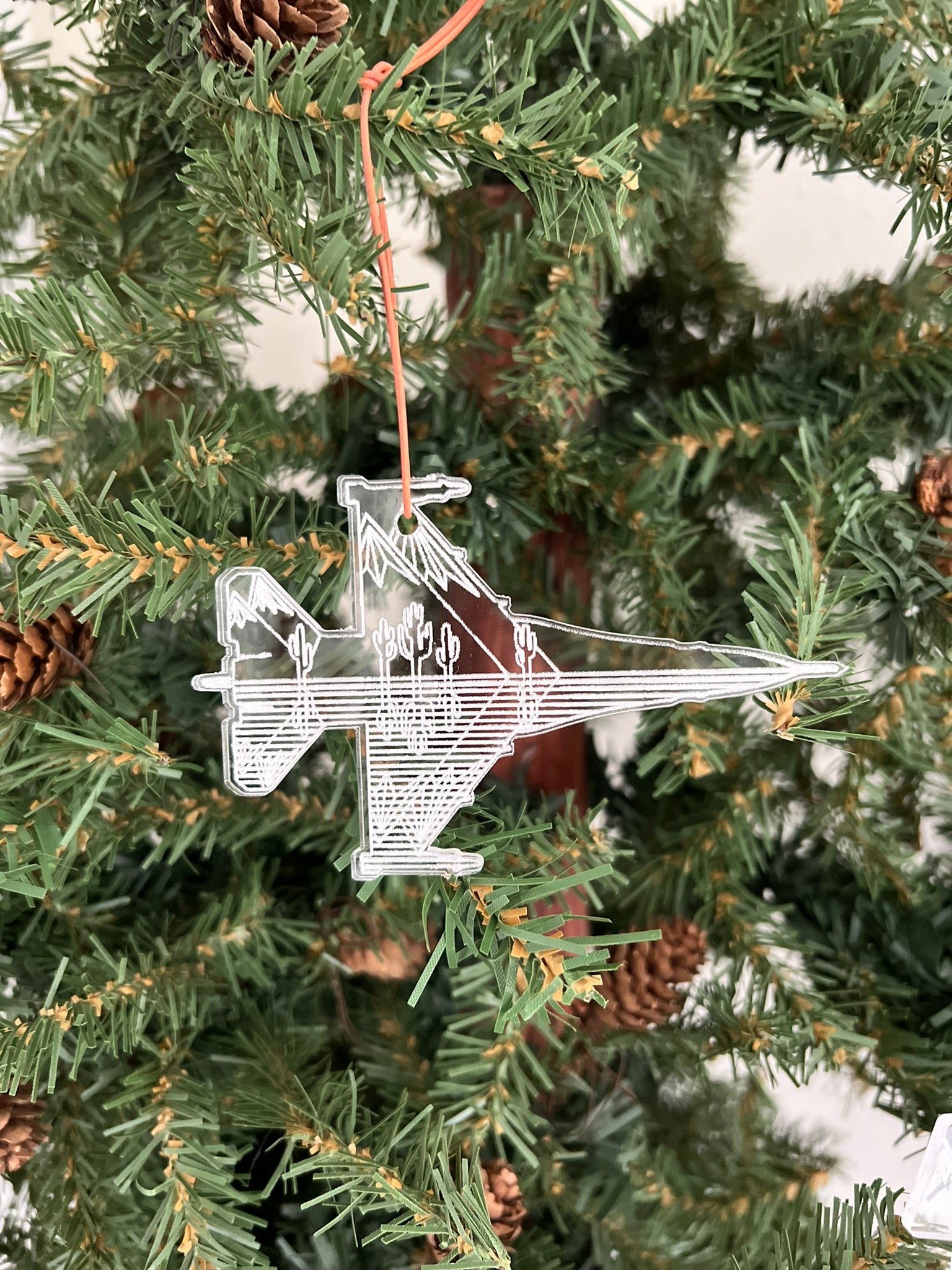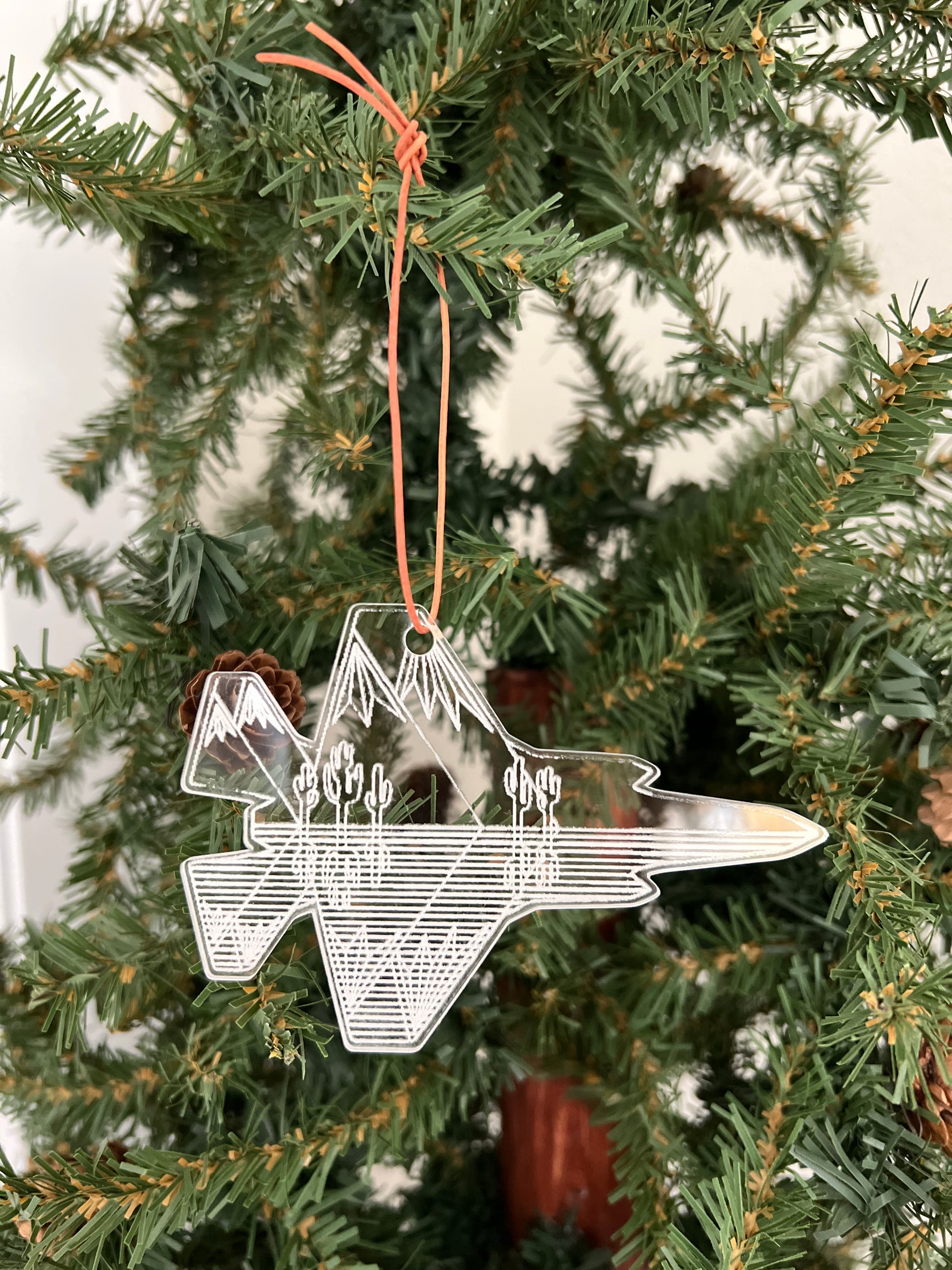 Lil Posh Shop and JLeeElements collaborated to bring you these exclusive engraved ornaments for any fighter jet lover. Featuring the exclusive Fighter Jet Mountain-scape designs by JLeeElements offered in F-15, F-16, F-18, F-22 and F-35. Choose from an evergreen tree or cacti design. When you purchase these ornaments, you are supporting not one, or two, but THREE military spouse owned businesses. Buy more, save more! Take advantage of our bulk ornament pricing.