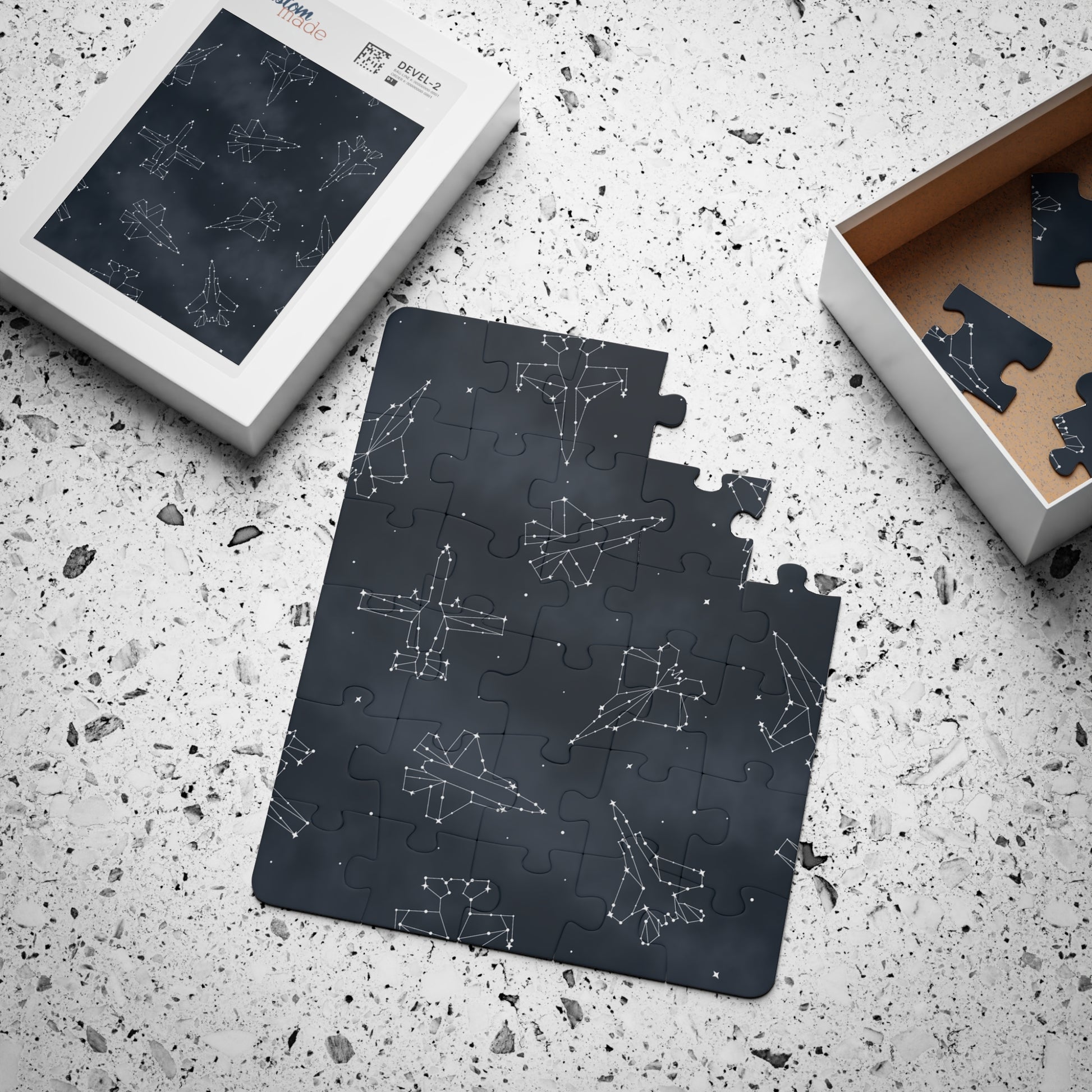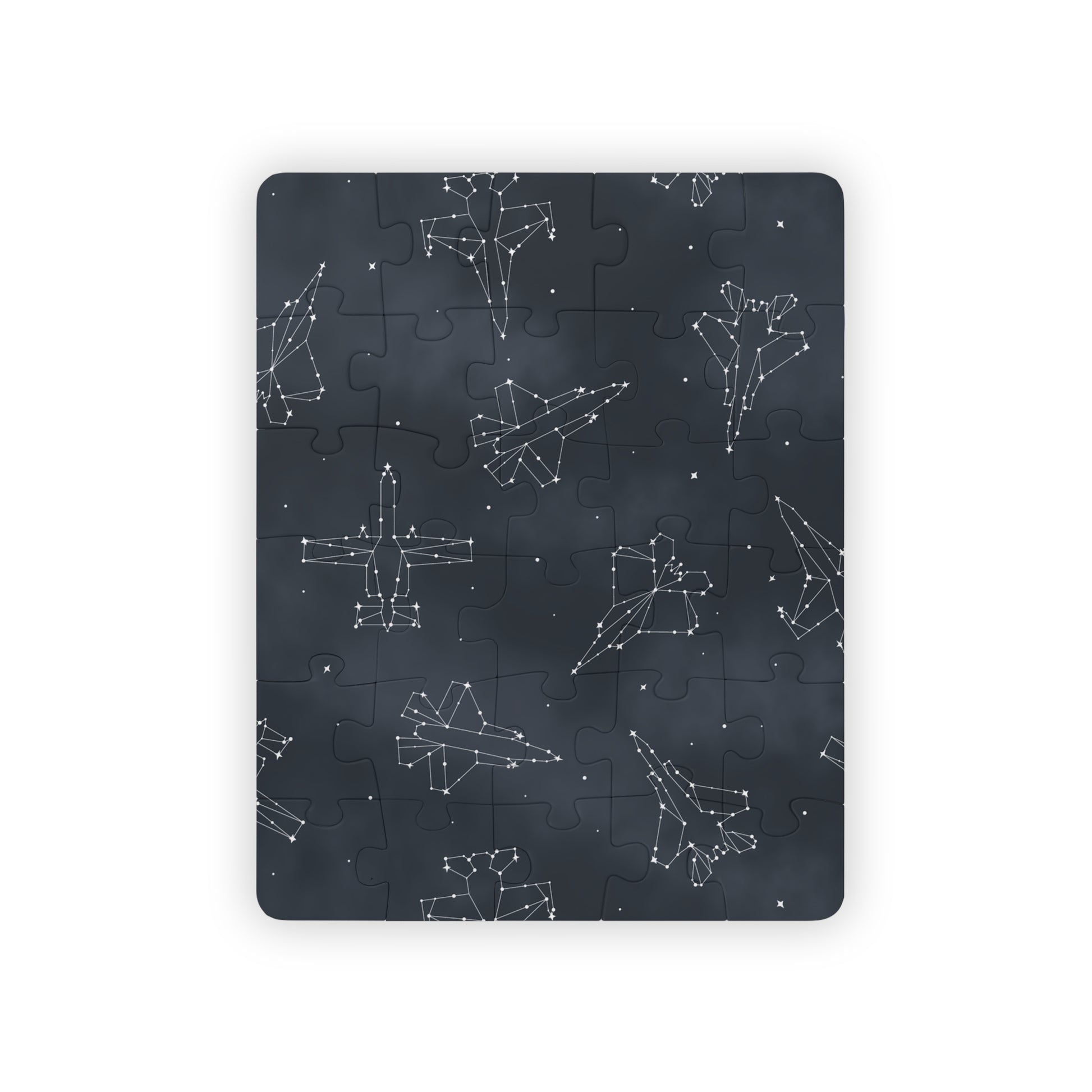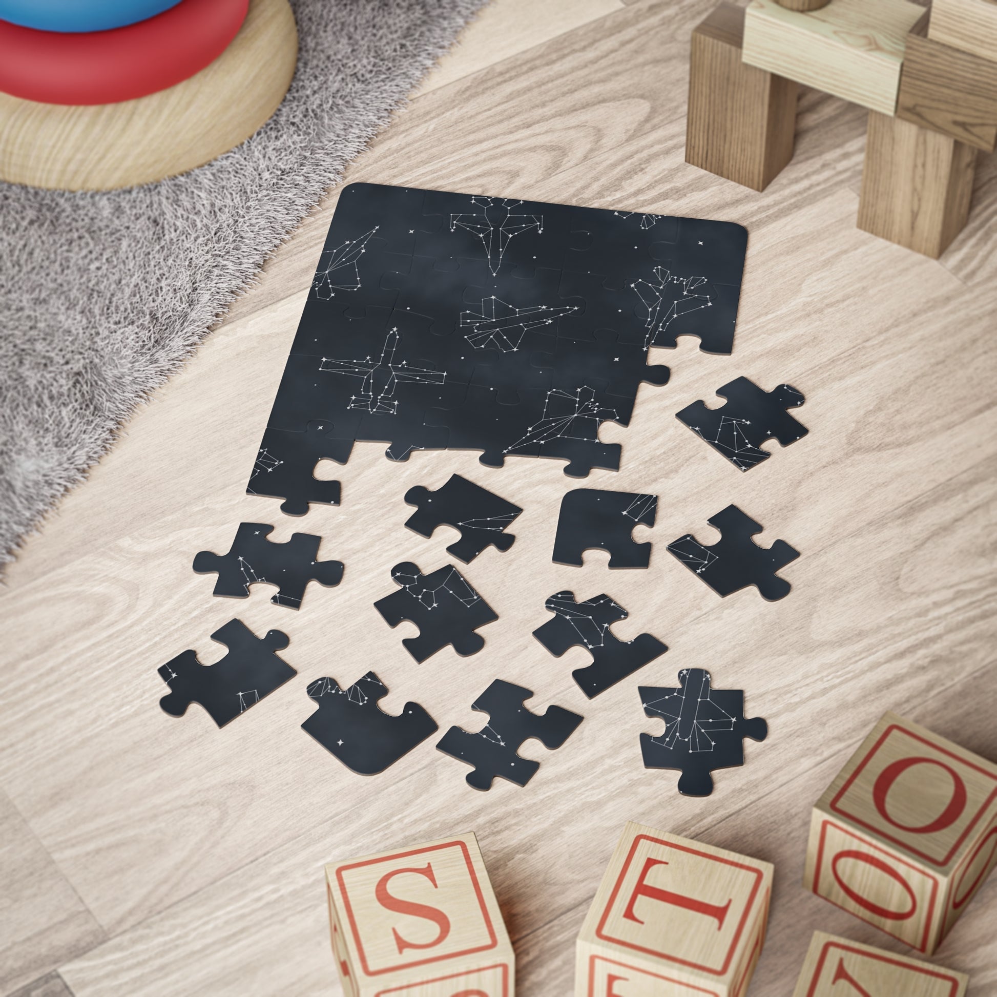 Our Starry Jet Night Kids’ Puzzle transforms the night sky into an aviation wonderland. Featuring the USAF’s iconic fighter jets — A-10, F-15, F-16, F-22, and F-35 — illustrated as glowing constellations, this puzzle captures the magic of stargazing with the thrill of flight.