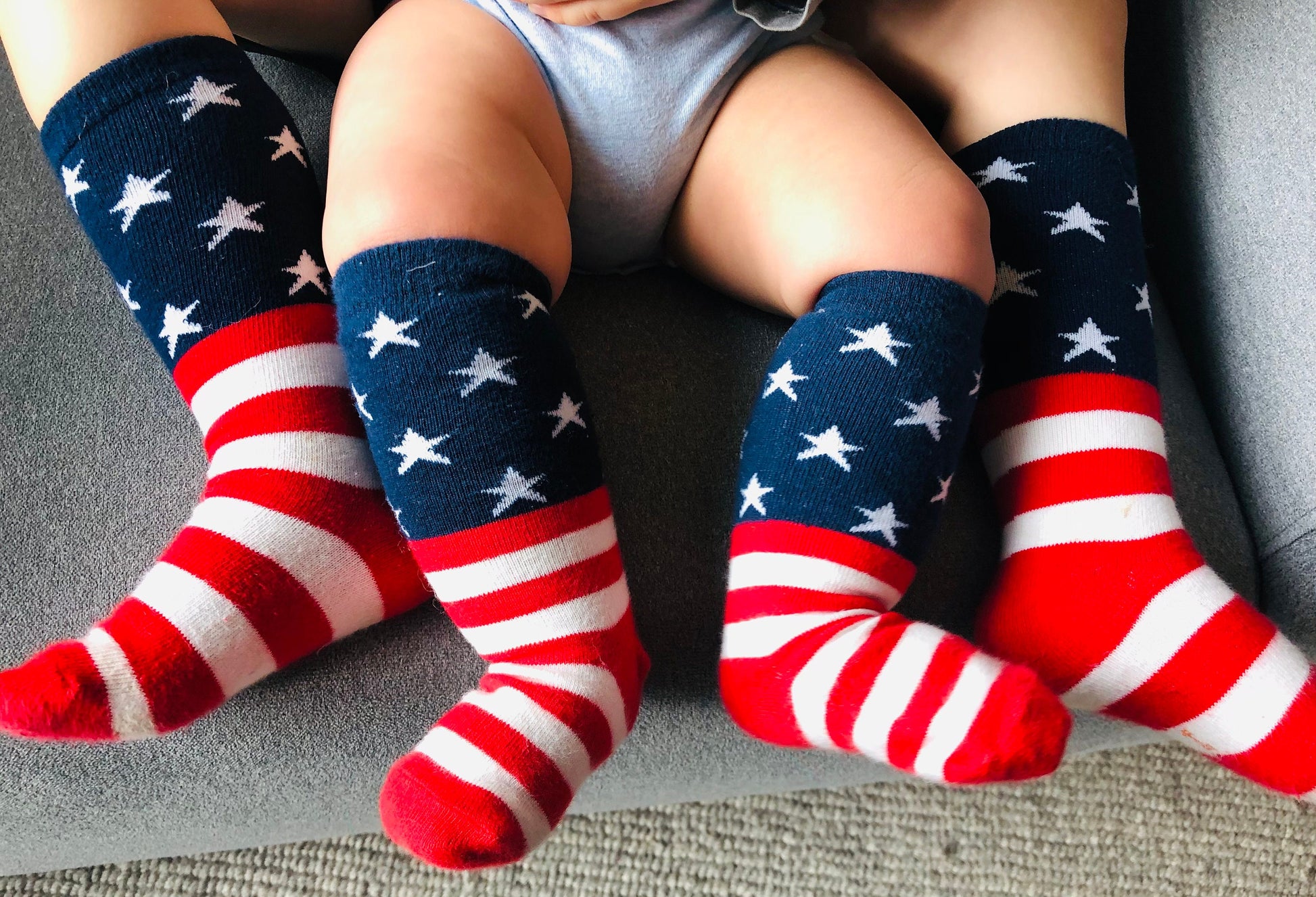 Stars & Stripes Baby/Toddler Knee High Cotton Socks available in 0-1 Yr, 1-3 yrs. and 4-6 yrs. 4-6 yrs. socks fit high on calves. Super soft with a nice elastic stretch. Show off their thunder thighs with these patriotic socks!